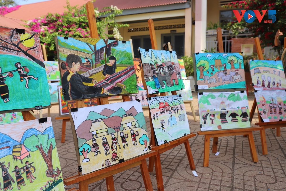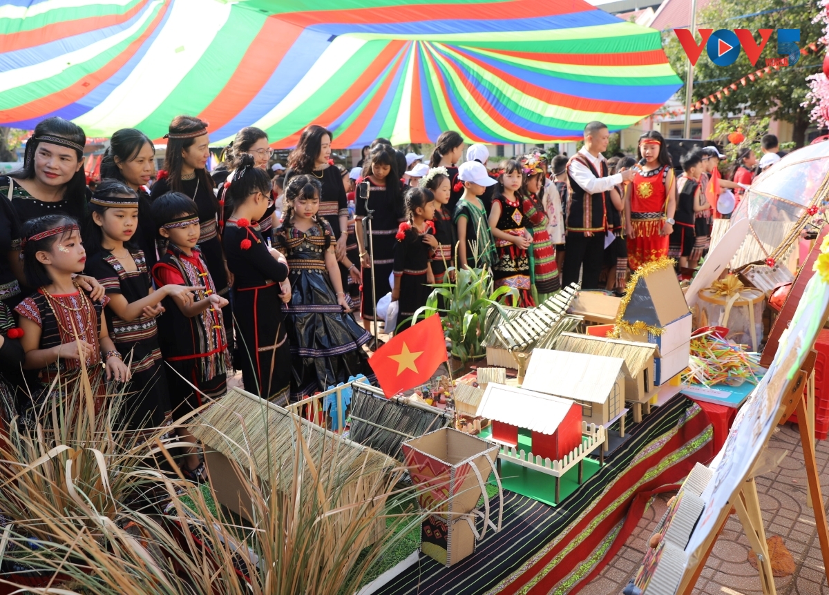 Tại trường Tiểu học Tô Hiệu, phường Ea Kao, tỉnh Đắk Lắk, các em học sinh trực tiếp tham gia cắt, dán, lắp ghép mô hình nhà dài, làm nhạc cụ truyền thống, trang trí trang phục với họa tiết hoa văn thổ cẩm, vẽ phong cảnh buôn làng...