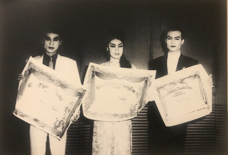 Nghệ sĩ Lệ Thủy và Thanh Sang nhận giải Thanh Tâm năm 1964, năm đó nghệ sĩ Diệp Lang (bìa phải) nhận bằng danh dự của giải. Ông đã đoạt giải Thanh Tâm năm 1963 - Ảnh: NVCC