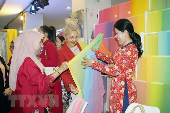 Đại diện các cơ quan ngoại giao trên địa bàn Thành phố Hồ Chí Minh tham quan khu trưng bày sản phẩm lụa may áo dài - Ảnh: Mỹ Phương/TTXVN |