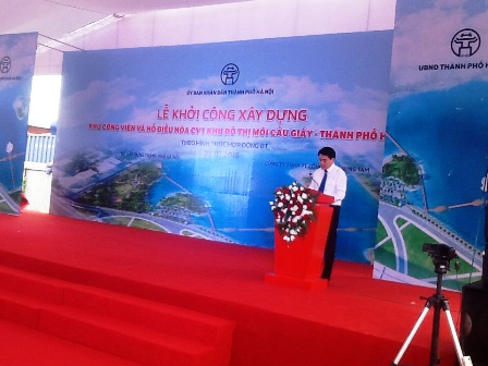 (VOV5) - Sáng 22/7, Chủ tịch Ủy ban nhân dân thành phố Hà Nội Nguyễn Đức Chung phát lệnh khởi công khu công viên và hồ điều hòa CV1 tại khu đô thị mới Cầu Giấy.