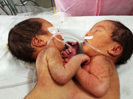 Khi sinh ra, hai bé gái song sinh trong tình trạng dính phần ngực và bụng với nhau.