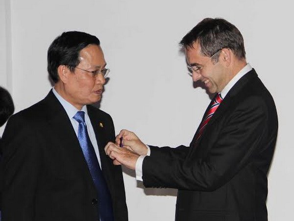 | Đại sứ Pháp trao Huân chương Cành cọ Hàn lâm cho ông Nguyễn Hữu Đức. (Nguồn: Đại sứ quán Pháp) |