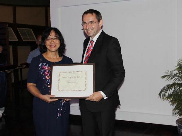 | Ông Jean-Noel Poirier, Đại sứ Pháp tại Việt Nam đã trao Huân chương Cành cọ Hàn lâm cho bà Nguyễn Thanh Huyền. (Ảnh: Đại sứ quán Pháp) |