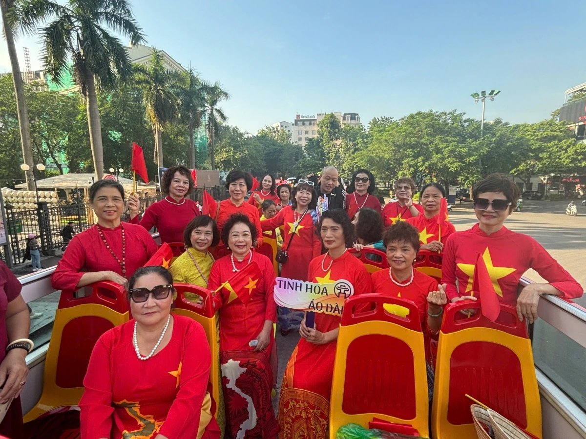 Chuyến xe buýt 2 tầng đi qua các điểm du lịch nổi tiếng của Hà Nội như: Tràng Tiền, Hồ Gươm, Hoàng Thành Thăng Long… Mỗi người đều mặc trang phục áo dài truyền thống rực rỡ màu sắc màu với niềm tự hào về nét đẹp văn hóa của người Việt, là biểu tượng của vẻ đẹp phụ nữ Việt Nam. Tự hào khoác lên mình bộ áo dài truyền thống in hình đất nước và lá cờ tổ quốc, bà Phạm Thị Kim Liên, phường Hàng Bồ, quận Hoàn Kiếm, hào hứng chia sẻ: