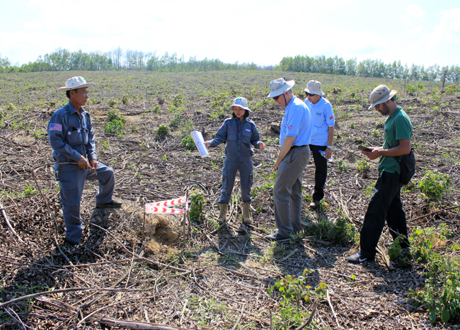 Quản lý Hoạt động Nguyễn Thị Diệu Linh và Cố vấn Kỹ thuật quốc gia Bùi Trọng Hồng dẫn Đại sứ và nhân viên sứ quán đến xem một quả bom bi do đội khảo sát phát hiện trong ngày thứ Hai. [Ảnh: Ngô Xuân Hiền/Dự án RENEW]