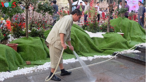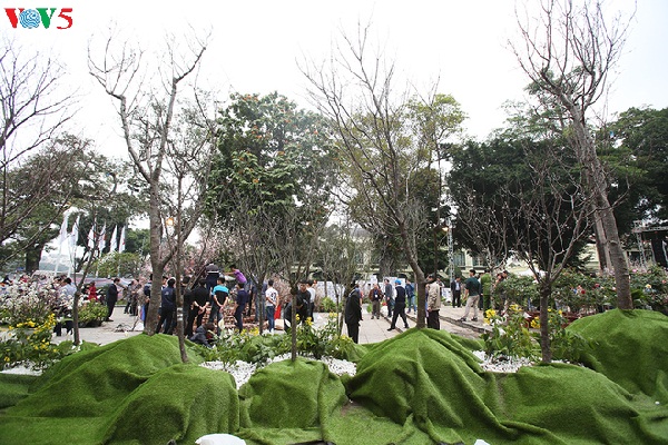 | Những cây hoa anh đào được đặt trong khung sắt và giữ cân bằng với những bao cát ẩm. Ngoài sân khấu lớn chính trước tượng đài vua Lý Thái Tổ còn có một sân khấu nhỏ ngay phía sau là khu sẽ diễn ra triển lãm hoa cũng đang được gấp rút hoàn thành. |