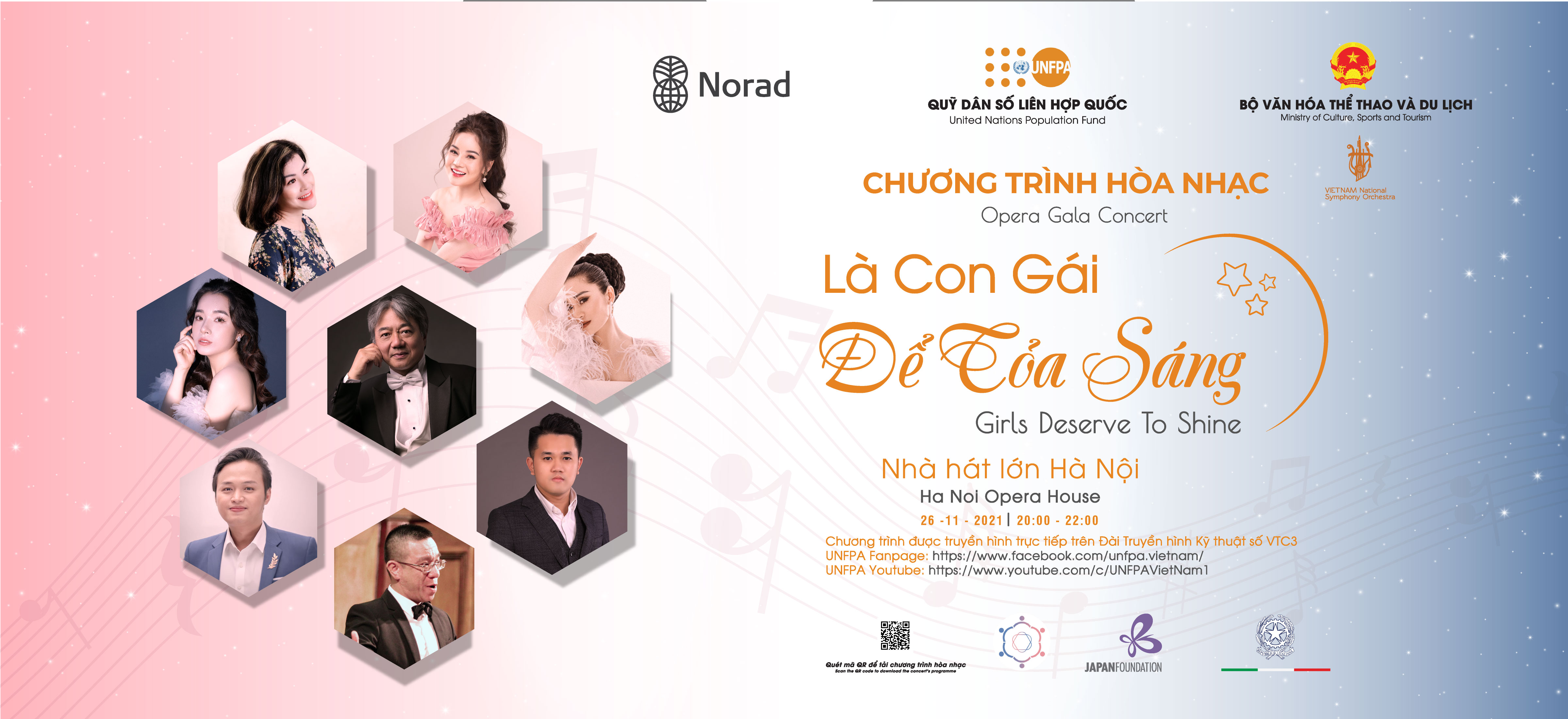 Hòa nhạc Opera Gala “Là Con gái để Tỏa sáng” sẽ được tổ chức tại Nhà Hát Lớn, Hà Nội, từ 20:00 đến 22:00 ngày 26 tháng 11 năm 2021 và sẽ được truyền hình trực tiếp trên kênh truyền hình kỹ thuật số VTC3 và trên trang Facebook và YouTube của Quỹ Dân số Liên hợp quốc (UNFPA).