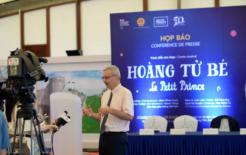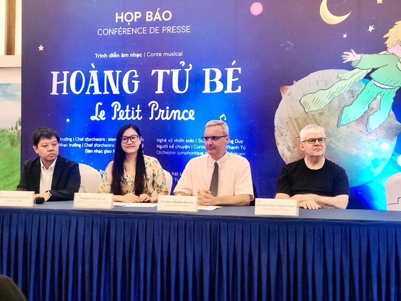 Trong buổi họp báo ngày 20/6, Đại sứ Pháp tại Việt Nam Nicolas Warnery cho biết, chương trình biểu diễn âm nhạc Hoàng tử bé là một hoạt động có ý nghĩa trong chuỗi sự kiện kỷ niệm 50 năm quan hệ ngoại giao giữa hai nước Việt Nam và Pháp. Đây cũng là dịp kỉ niệm 80 năm ngày cuốn sách Hoàng tử bé ra đời. Ngài Đại sứ nhấn mạnh: “Buổi biểu diễn mà chúng tôi sẽ giới thiệu trong tối 23 và 24/6 là hoạt động hợp tác giữa Đại sứ quán Pháp, Viện Pháp Việt Nam, Dàn nhạc Giao hưởng Việt Nam, Bộ Văn hóa – Thể thao và Du lịch cùng nhiều đối tác khác. Chúng tôi mong muốn giới thiệu một phương pháp tiếp cận dưới 3 góc độ. Đó là phần kể chuyện do chị Hứa Thanh Tú thể hiện, phần hình ảnh của nghệ sĩ truyện tranh Joann Sfar, và phần âm nhạc của nhà soạn nhạc kiêm nhạc trưởng Marc-Oliver Dupin”.