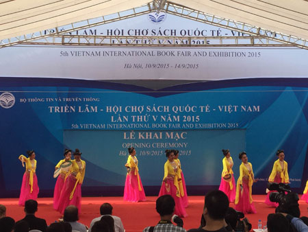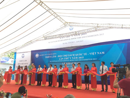 | Lễ cắt băng khai mạc Triển lãm – Hội chợ sách Sách quốc tế - Việt Nam năm 2015 . Ảnh: hanoimoi.com.vn |
