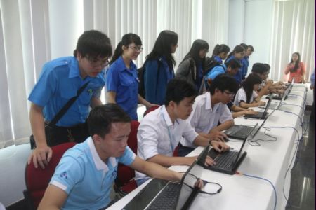 | Các thí sinh tham gia thi trực tuyến hội thi Tự hào sử Việt 2015 tại tòa soạn báo Tuổi Trẻ - Ảnh: TIẾN LONG |