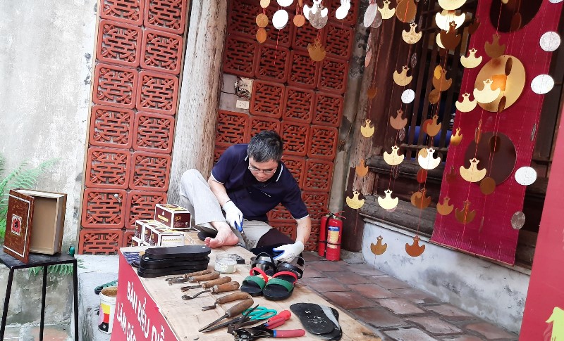 Nghệ nhân trình diễn nghề làm dép cao su |
