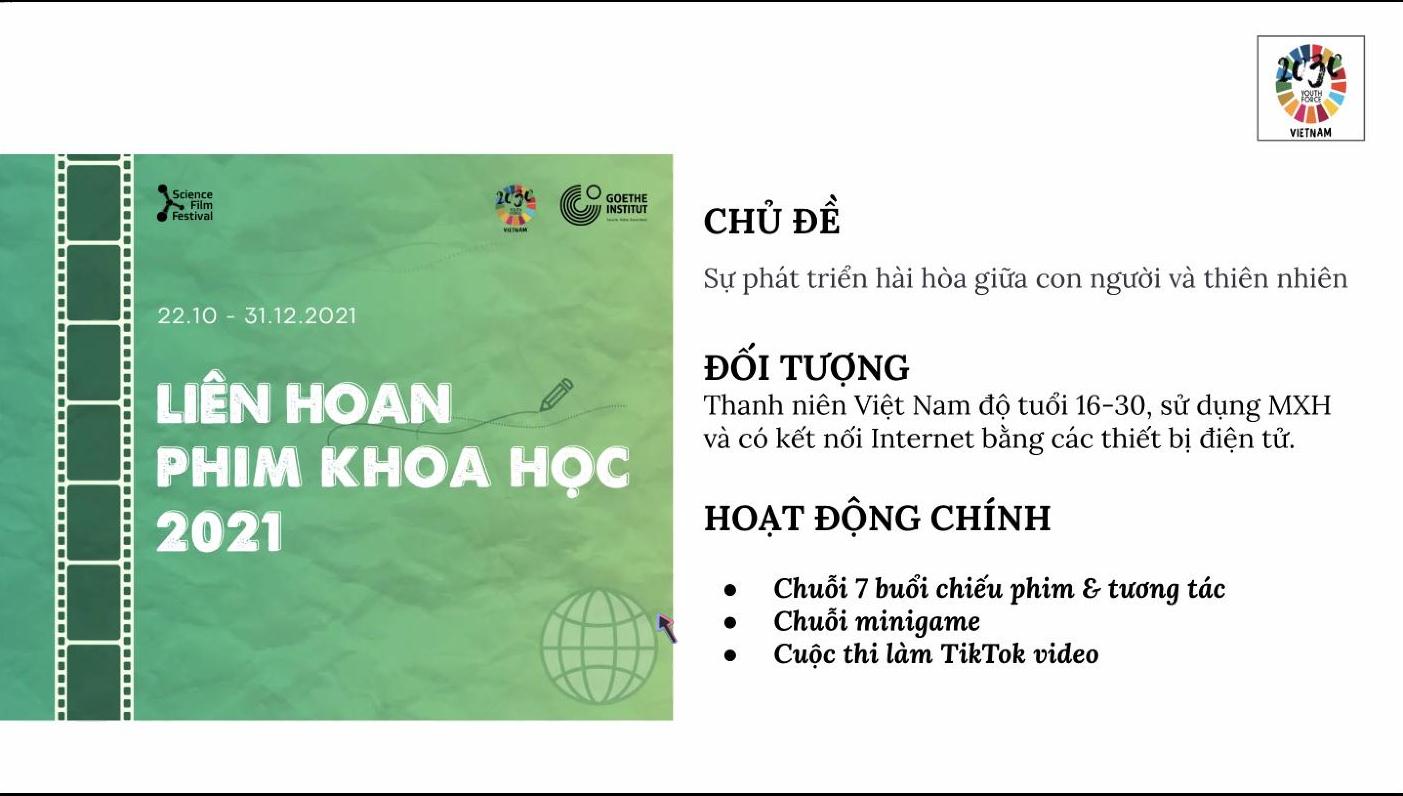 Tại buổi họp báo về LHP, ông Wilfried Eckstein, Viện trưởng Viện Goethe cho biết: “Liên hoan phim Khoa học là sự phản ứng với tình hình đại dịch trên thế giới và vì thế đã lấy chủ đề trọng tâm cho năm nay là SỨC KHỎE. Viện Goethe đã đưa LHP khoa học đến Việt Nam từ năm 2010. LHP không chỉ bao gồm phim mà còn có các hoạt động thực hành dành cho học sinh, kết hợp niềm đam mê khám phá khoa học với thử nghiệm. Chương trình hướng đến đối tượng là giáo viên, học sinh và phụ huynh.