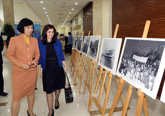 Bà Marinela Petkova, Đại sứ Cộng hòa Bulgaria tại Việt Nam cùng Phó Tổng giám đốc TTXVN Vũ Việt Trang tham quan triển lãm. - Ảnh: Danh Lam/TTXVN |