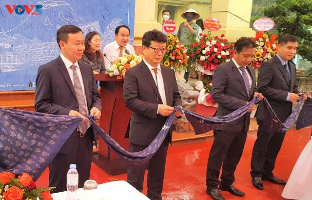 Các đại biểu kéo băng khai mạc trưng bày. Ảnh: Ngọc Anh/ VOV5 |