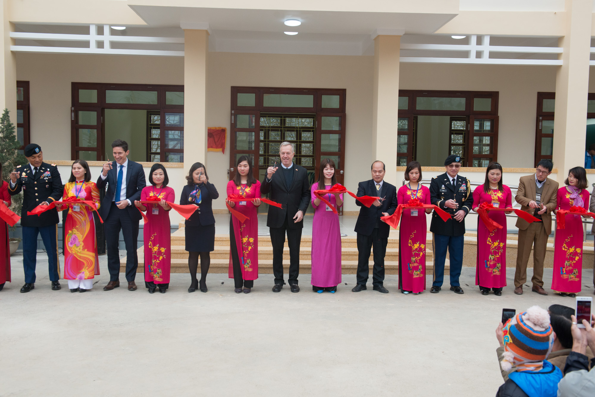 | Các thành viên của Phái đoàn Hoa Kỳ và đại diện tỉnh Hà Giang cắt băng khánh thành trong buổi lễ bàn giao Trường tiểu học Phố Bảng |