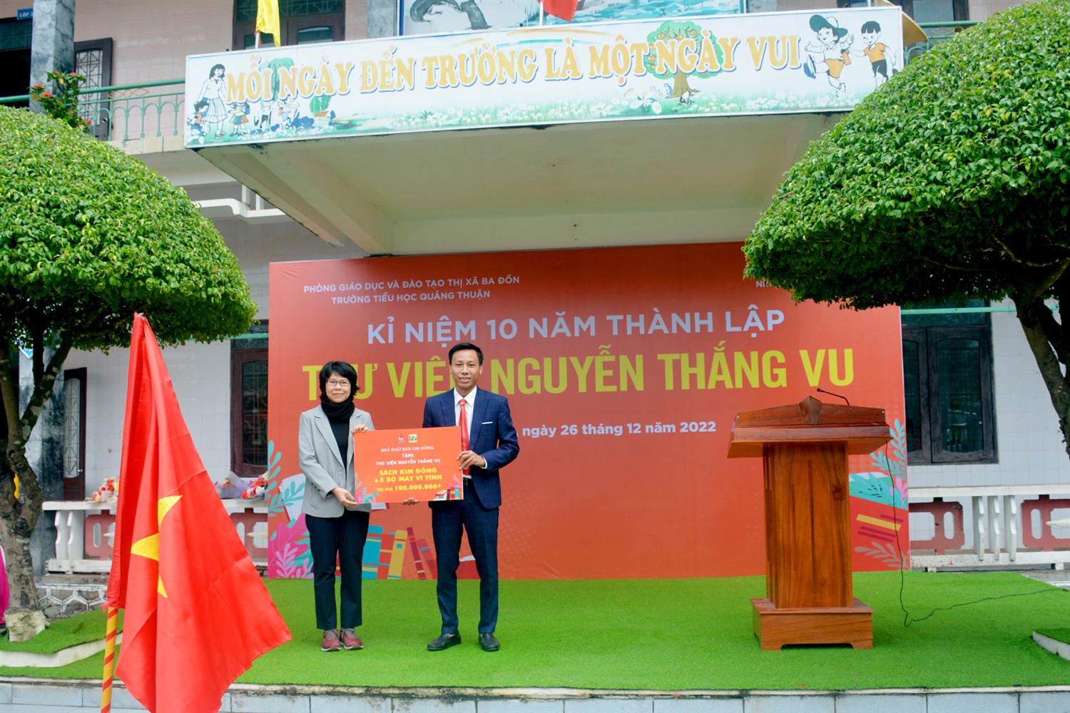 Bà Vũ Thị Quỳnh Liên – Phó Giám đốc, Tổng biên tập NXB Kim Đồng đại diện NXB Kim Đồng tặng thư viện Nguyễn Thắng Vu hơn 1000 cuốn sách và 5 bộ máy tính, tổng trị giá trên 100 triệu đồng. |