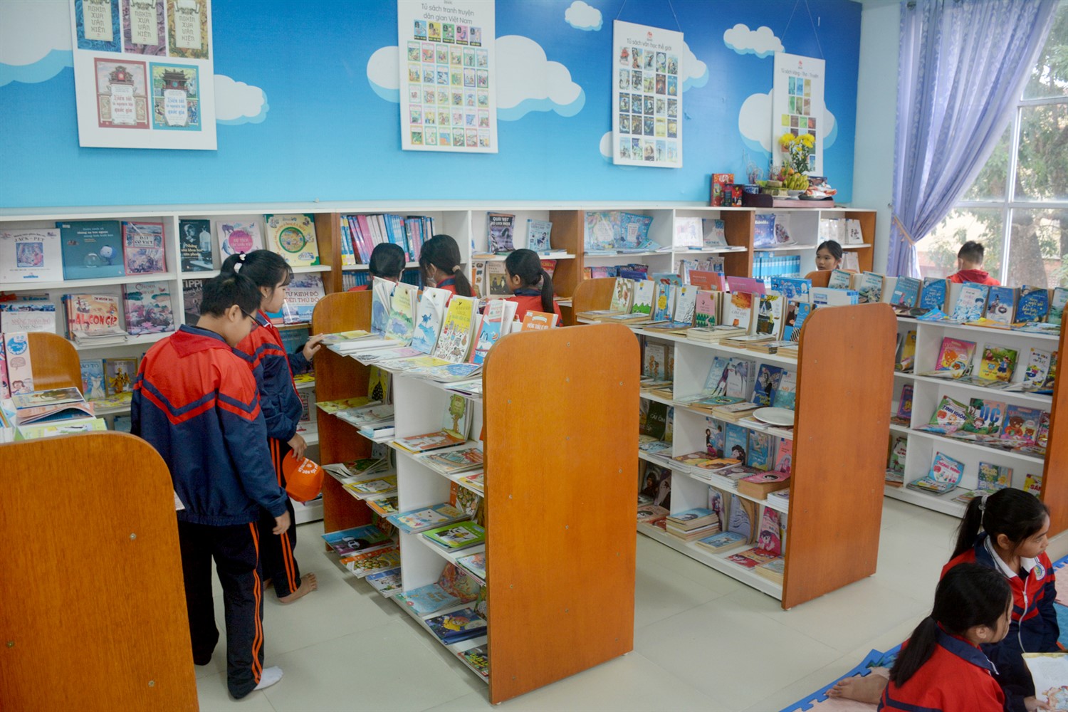 Trong 10 năm qua, NXB Kim Đồng đã thường xuyên hỗ trợ sách, bổ sung giá sách, bàn ghế phục vụ bạn đọc tại Thư viện. Nhằm đáp ứng nhu cầu bạn đọc, hàng năm nhà trường cũng đã đầu tư kinh phí để bổ sung thêm sách và tư liệu phục vụ bạn đọc. Đến nay, thư viện đã có trên 7000 đầu sách truyện, tài liệu tham khảo các loại. Ngoài ra thư viện còn có 2 máy tính kết nối mạng Internet để bạn đọc có thể đọc sách báo và tra cứu các thông tin khác.