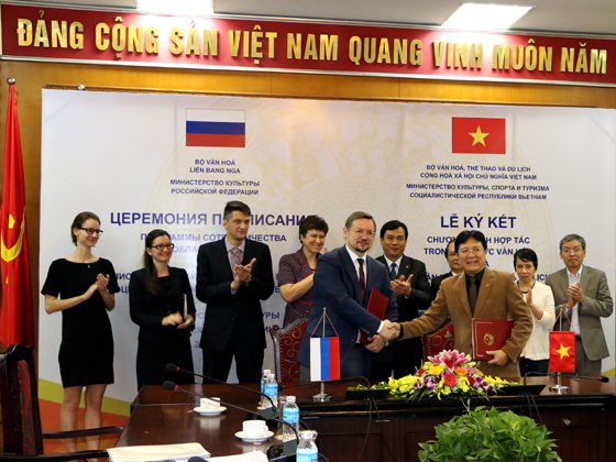(VOV5) - Chiều 25/11, tại Hà Nội, Bộ Văn hoá Thể thao và Du lịch Việt Nam và Bộ Văn hoá Liên bang Nga ký kết chương trình hợp tác trong lĩnh vực văn hoá giữa 2 nước giai đoạn 2016 - 2018. Phát biểu tại lễ ký kết, Thứ trưởng Bộ Văn hoá Thể thao và Du lịch Vương Duy Biên cho biết Chương trình hợp tác trong lĩnh vực văn hoá giữa Bộ Văn hoá Thể thao và Du lịch Việt Nam và Bộ Văn hoá Liên bang Nga giai đoạn 2016 – 2018 nhằm củng cổ, phát triển hợp tác song phương trong lĩnh vực văn hoá nghệ thuật giữa 2 nước.