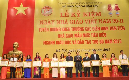 Cùng ngày, Sở Giáo dục và Đào tạo Hà Nội tổ chức tuyên dương khen thưởng các điển hình tiên tiến, nhà giáo mẫu mực tiêu biểu của Thủ đô năm 2015. Tại buổi lễ, ngành giáo dục Hà Nội tuyên dương, khen thưởng các tập thể, cá nhân, điển hình tiên tiến, nhà giáo mẫu mực trong công tác giảng dạy, quản lý. Tại thành phố Hồ Chí Minh, Báo Sài Gòn Giải phóng, Công ty Prudential Việt Nam phối hợp tổ Lễ trao Giải thưởng Võ Trường Toản lần thứ 18 cho các thầy, cô giáo và cán bộ quản lý có thành tích giảng dạy xuất sắc trong công tác giảng dạy, đóng góp tích cực cho sự nghiệp giáo dục và đào tạo. Cũng dịp này, Ủy ban nhân dân tỉnh Lào Cai tổ chức tuyên dương khen thưởng gần 600 nhà giáo tiêu biểu của tỉnh năm 2015. Những nhà giáo được tuyên dương tại các buổi lễ là những giáo viên tiêu biểu, những người không ngừng đổi mới phương pháp giảng dạy, có thành tích nổi bật, trong chuyên môn cũng như trong các phong trào thi đua cấp cơ sở, có sáng kiến, giải pháp cụ thể nhằm nâng cao chất lượng dạy và học tại nhà trường, từ đó đóng góp tích cực cho công cuộc “Đổi mới căn bản, toàn diện giáo dục và đào tạo” của các địa phương.