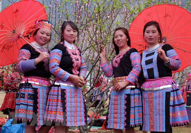 Người con gái Mông trong trang phục truyền thống bên hoa đào - Ảnh: Diệp Anh/TTXVN |