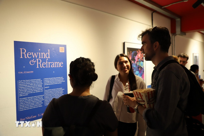 Nhiều khán giả xem triển lãm “Rewind and Reframe” bên ngoài phòng chiếu phim trong lễ khai mạc liên hoan. Ảnh: Phong Hà/TTXVN |