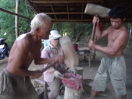 | Ông Thạch Miel đang quết cốm |