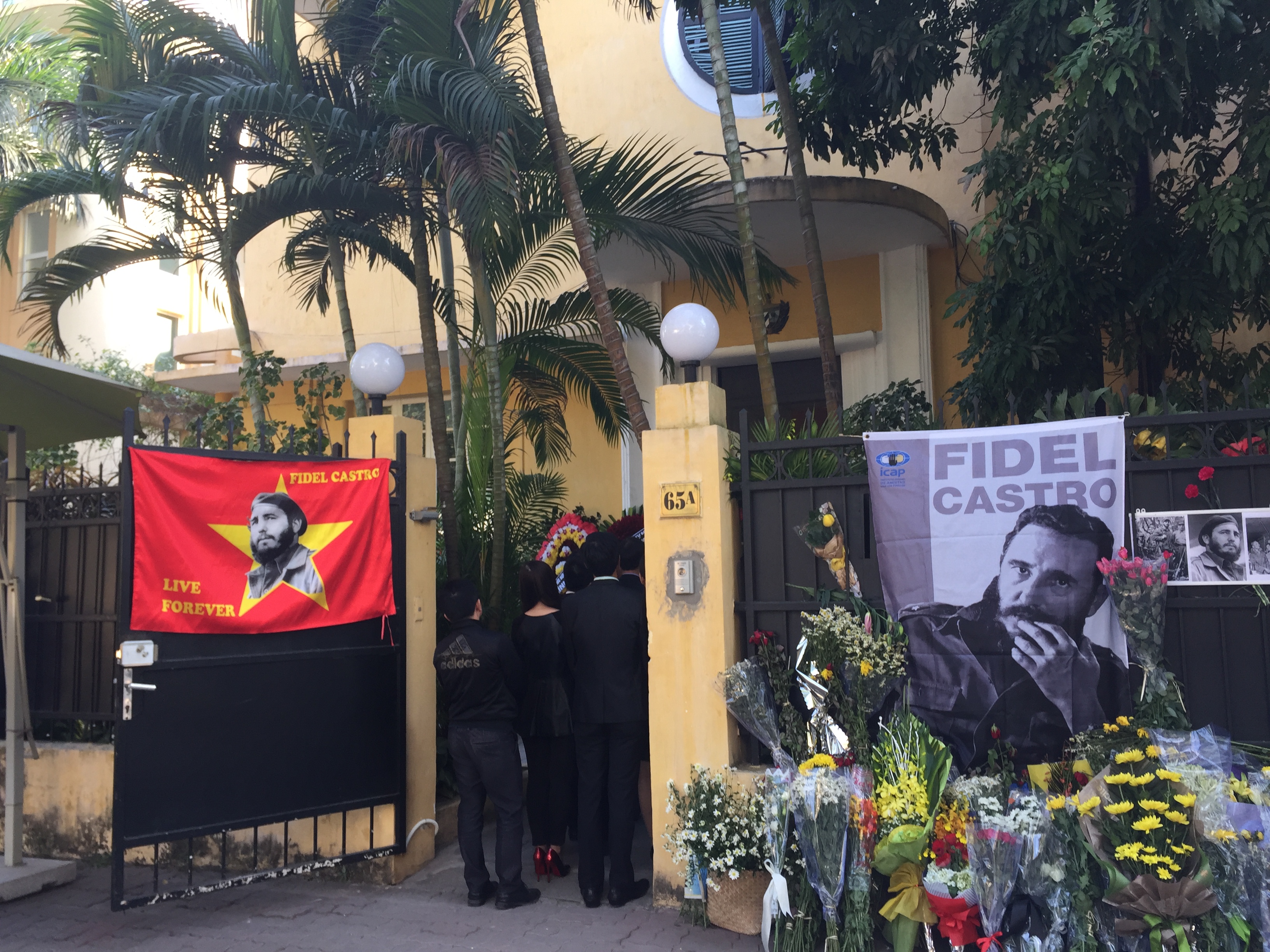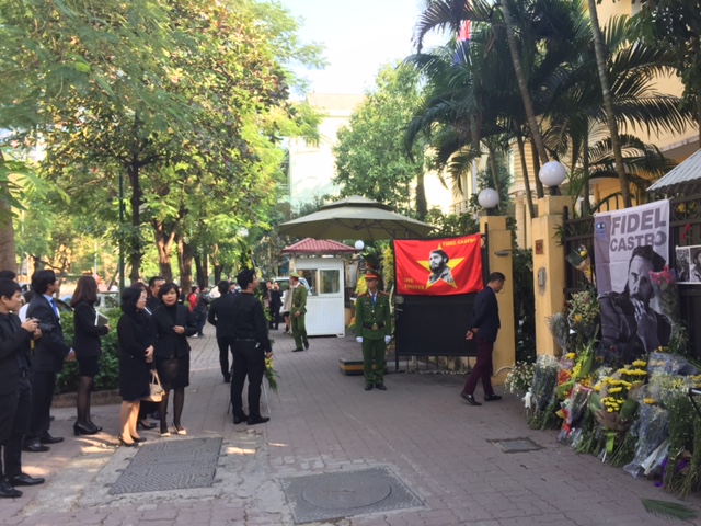 | Người dân chờ đến lượt viếng trước cửa đại sứ quán Cuba |