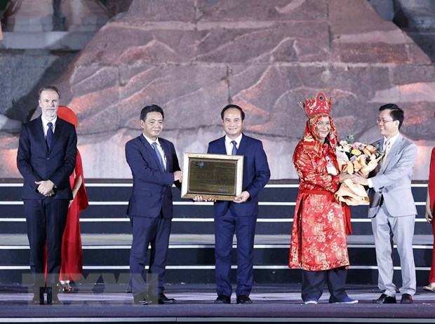 Ông Hoàng Đạo Cương, Thứ trưởng Bộ Văn hoá, Thể thao và Du lịch trao Bằng ghi danh 'Thực hành Then của người Tày, Nùng, Thái ở Việt Nam' vào danh sách Di sản văn hóa phi vật thể đại diện của nhân loại cho lãnh đạo tỉnh Tuyên Quang. Ảnh: Thống Nhất/TTXVN |