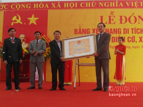 | Ông Lê Minh Thông - Ủy viên BTV Tỉnh ủy - Phó Chủ tịch UBND tỉnh Nghệ An trao Bằng công nhận Di tích lịch sử cấp Quốc gia cho Đền Diên Cờ xã Nghi Trường, Nghi Lộc. Ảnh: baonghean |