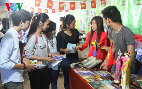 | Khách tham quan nghe giới thiệu về văn hóa, du lịch tại gian hàng của Việt Nam. |