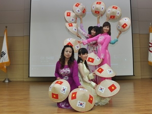 Tiết mục múa nón tự biên tự diễn của các cô dâu Việt ở Xứ sở Kim Chi.