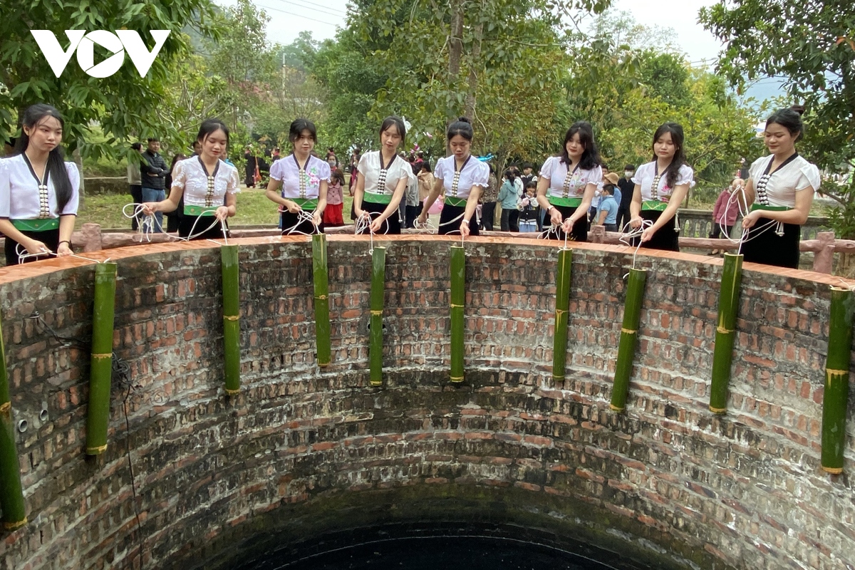 Nghi thức lấy nước cúng từ giếng nước Nàng Han của thiếu nữ Thái trắng - Ảnh: Khắc Kiên/VOV |