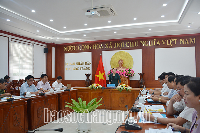 Phó Chủ tịch UBND tỉnh Sóc Trăng Huỳnh Thị Diễm Ngọc phát biểu tại cuộc họp. Ảnh: Báo Sóc Trăng.org.vn |