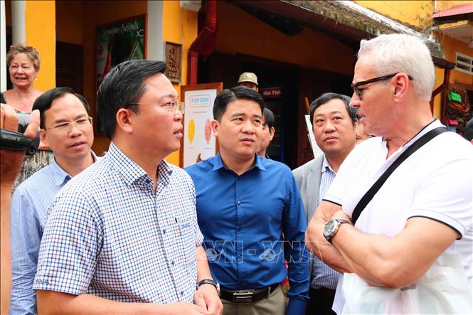 Chủ tịch UBND tỉnh Quảng Nam Lê Trí Thanh (bên trái) trò chuyện cùng du khách quốc tế tham quan Hội An. - Ảnh: TTXVN |