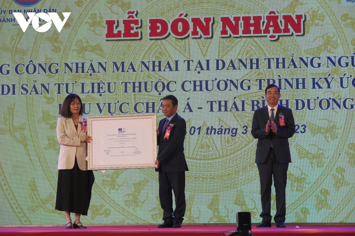 Bà Miki Nozawa, Đại diện UNESCO tại Việt Nam trao Bằng công nhận Di sản Ma Nhai tại Danh thắng Ngũ Hành Sơn cho ông Hoàng Đạo Cương, Thứ trưởng Bộ Văn hóa, Thể thao và Du lịch. Ảnh: VOV |