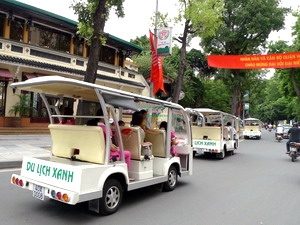 | Xe chạy điện đưa du khách tham quan khu vực Hồ Hoàn Kiếm. (Ảnh: Thanh Hà/TTXVN) |