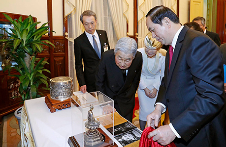 Chủ tịch nước Trần Đại Quang (phải) cùng Vua và Hoàng hậu Nhật chiêm ngưỡng món quà. Ảnh: Nhan Hữu Sáng.