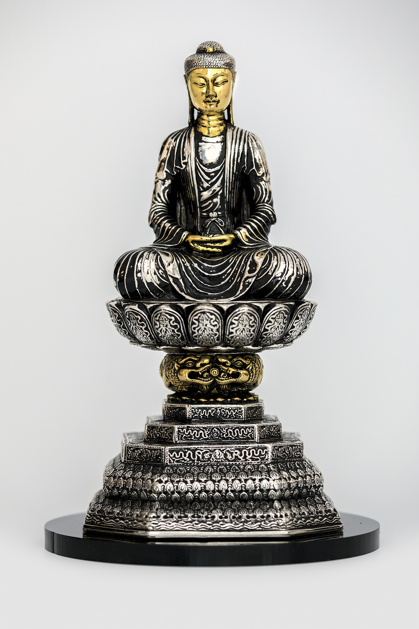 Với sự cố vấn của nhà sử học Dương Trung Quốc, phiên bản độc đáo được Circle Group chế tác bằng Bạc nguyên chất, đúc bằng công nghệ áp lực chân không khí trơ liên hoàn để đảm bảo sự nguyên khối, với chiều cao 24cm vẫn thể hiện được thần thái và đạt độ chính xác cao trong kĩ thuật chế tác do người Việt Nam triển khai, trọng lượng pho tượng nặng hơn 4kg. Diện mặt, cổ, tai, bàn tay và đôi sư tử được mạ vàng 24k, tượng được đặt trên đế gỗ Trắc cao 5,5cm, thông tin song ngữ (Việt – Nhật) được khắc tinh tế xung quanh, tượng được bảo quản bởi lớp hộp mica trong suốt, hộp sơn mài bọc da có chứa đựng toàn bộ thông tin, lịch sử và giá trị nghệ thuật của pho tượng, và ngoài cùng là hộp gỗ bọc da bảo vệ tránh mọi sự tác động từ bên ngoài.