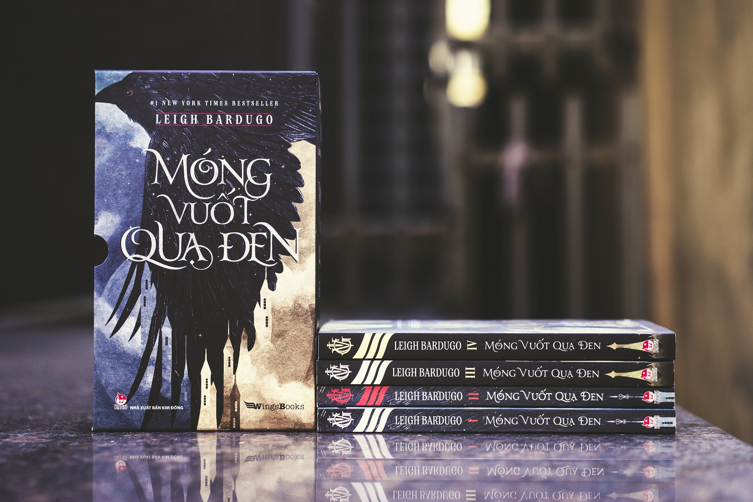 Bốn tập sách Móng Vuốt Quạ Đen của tác giả Leigh Bardugo, dịch giả Hoàng Anh chuyển ngữ do NXB Kim Đồng - Wings Books phát hành gồm Tập 1: Sáu kẻ bất hảo, Tập 2: Phi vụ bất khả, Tập 3: Mưu ma chước quỷ, Tập 4: Giang hồ hiểm ác