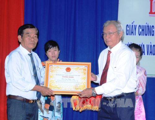 | Ông Dương Văn Phong (phải) Giám đốc Sở Văn hóa, Thể thao và Du lịch tỉnh Tây Ninh trao giấy chứng nhận “múa trống Chhay-dăm” là di sản văn hóa phi vật thể quốc gia cho đại diện xã Trường Tây. Ảnh: TTXVN |