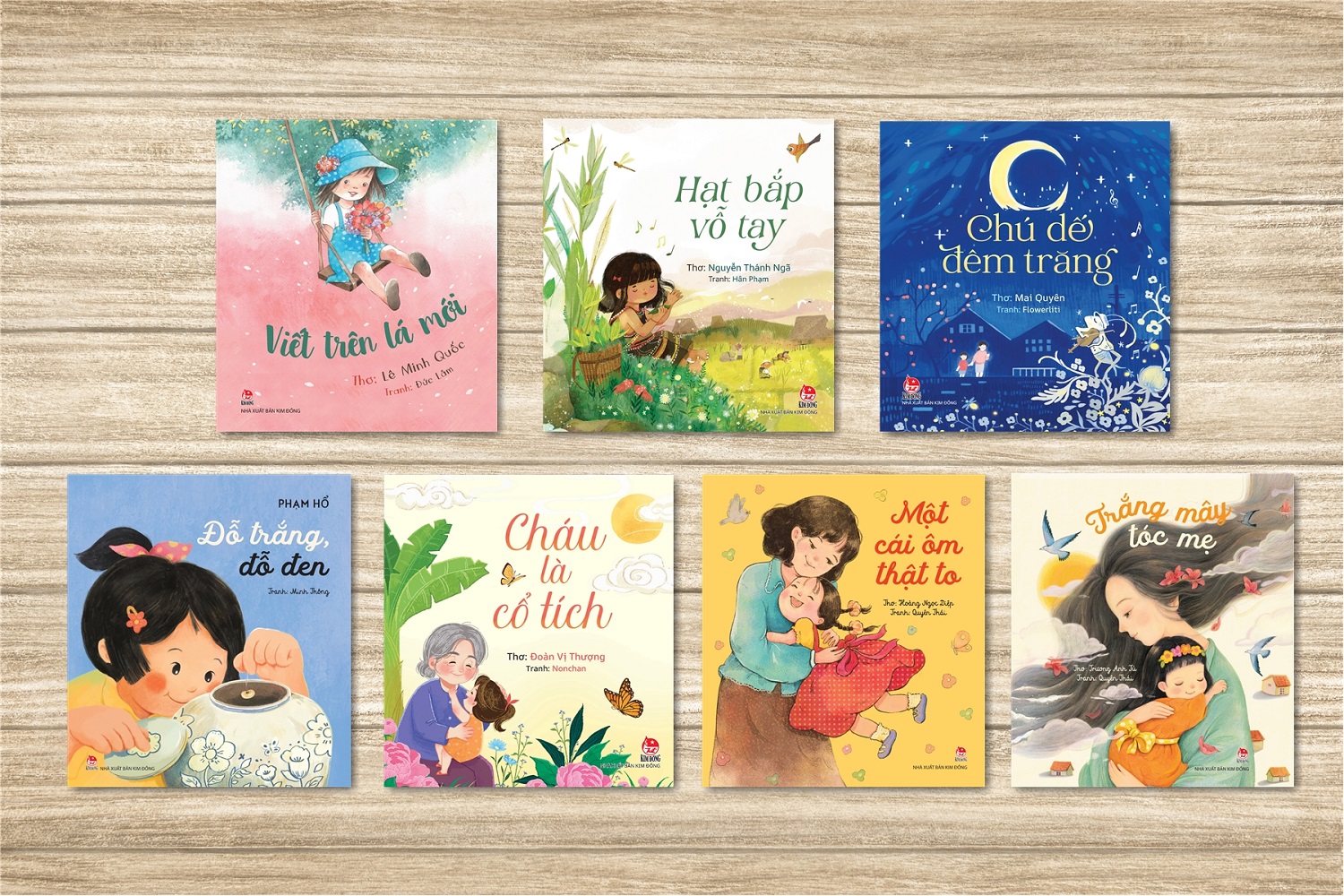 Nhiều tập thơ thiếu nhi mới đặc sắc của các nhà thơ nhiều thế hệ được NXB Kim Đồng giới thiệu nhân Ngày thơ Việt Nam.. Đó là tuyển tập thơ “Đỗ trắng, đỗ đen” (Phạm Hổ), “Viết trên lá mới” (Lê Minh Quốc), “Cháu là cổ tích” (Đoàn Vị Thượng), “Chú dế đêm trăng” (Mai Quyên), “Hạt bắp vỗ tay” (Nguyễn Thánh Ngã), “Trắng mây tóc mẹ” (Trương Anh Tú), “Một cái ôm thật to” (Hoàng Ngọc Diệp)... Những tập thơ trong trẻo, ấm áp cùng minh họa màu sống động sẽ góp phần nuôi dưỡng tâm hồn, bồi đắp ngôn ngữ tiếng Việt giàu đẹp cho các bạn nhỏ.