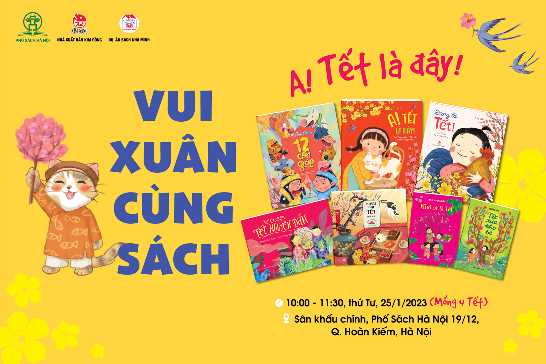 Sáng mồng 4 Tết (25/1/2023), NXB Kim Đồng phối hợp với Dự án Sách Nhà Mình tổ chức chương trình Vui Xuân Cùng Sách – A! Tết Là Đây! tại Phố Sách Hà Nội. Trong chương trình, các bạn nhỏ được tham gia các trò chơi thú vị tìm hiểu về phong tục Tết cổ truyền, tập làm nhà thơ, đố vui tìm hiểu về 12 con giáp, tìm hiểu truyện về danh nhân lịch sử có gắn với hình tượng mèo…
