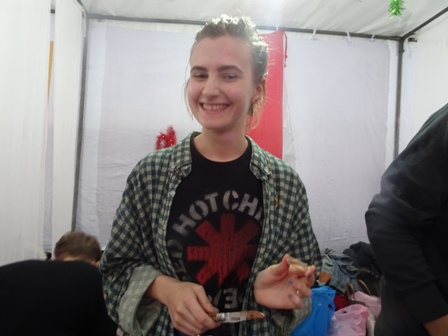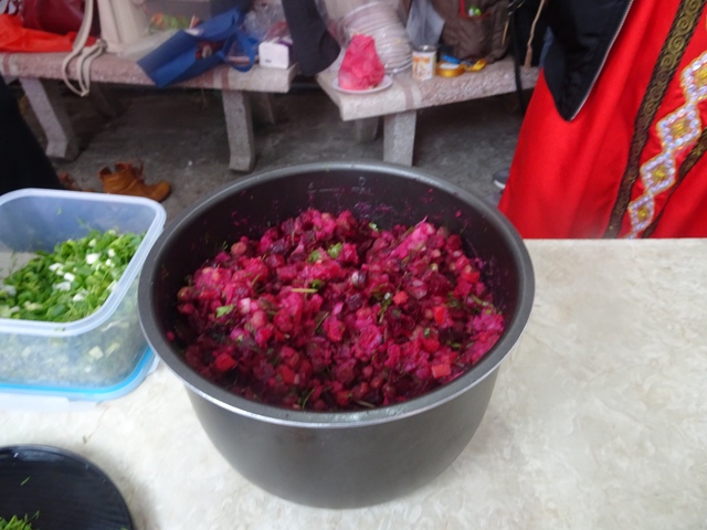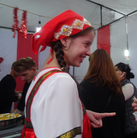 “Hôm nay ở đây, em xin giới thiệu một số món ăn truyền thống. Đólà bánh Kếp, thịt bò ầm củ qua và salad tím. Bánh crếp người Nga thường ăn vào lễ tiễn mùa Đông, tức là cuối mùa Đông. Còn hai món kia ăn hàng ngày. Lần đầu tiên tham gia lễ hội này, em rất thích có rất nhiều các bạn sinh viên nhiều nước khác nhau. Em có thể thưởng thức nhiều món ăn và qua đó biết thêm văn hóa của các nước khác”.