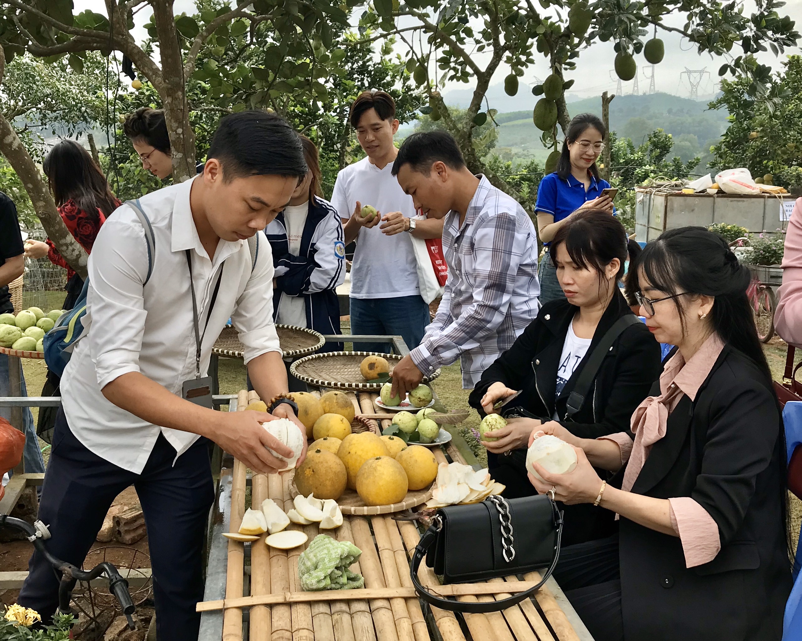 Ngoài ra, trong buổi sáng cùng ngày, du khách còn trải nghiệm tại nhà vườn trái cây Định Tâm với nhiều loại cây ăn quả phát triển xanh tốt, trĩu quả, như: cam, bưởi, ổi...