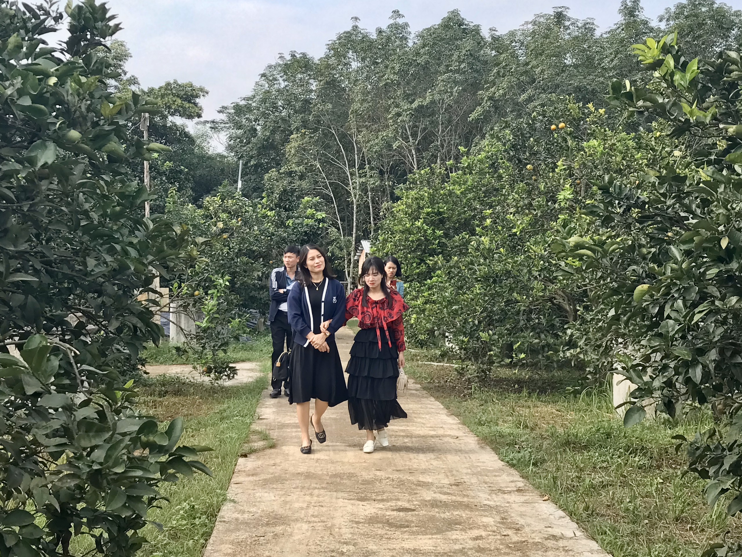 Đoàn thăm vườn cam tại Hợp tác xã 1-5. Ảnh: Lan Phương |