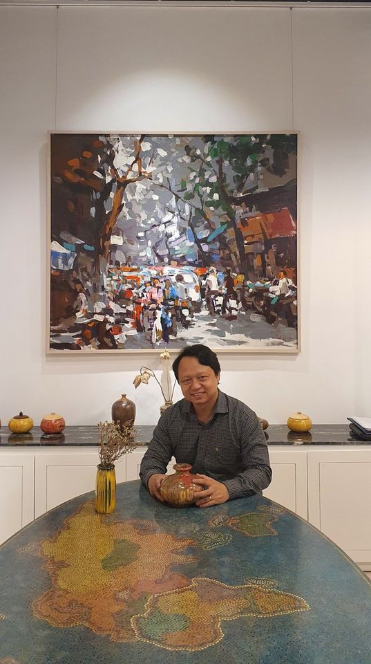 Nghệ sĩ Lê Xuân Hưởng và những sản phẩm từ bút chì màu do anh thiết kế: bàn bản đồ thế giới, lọ hoa... |