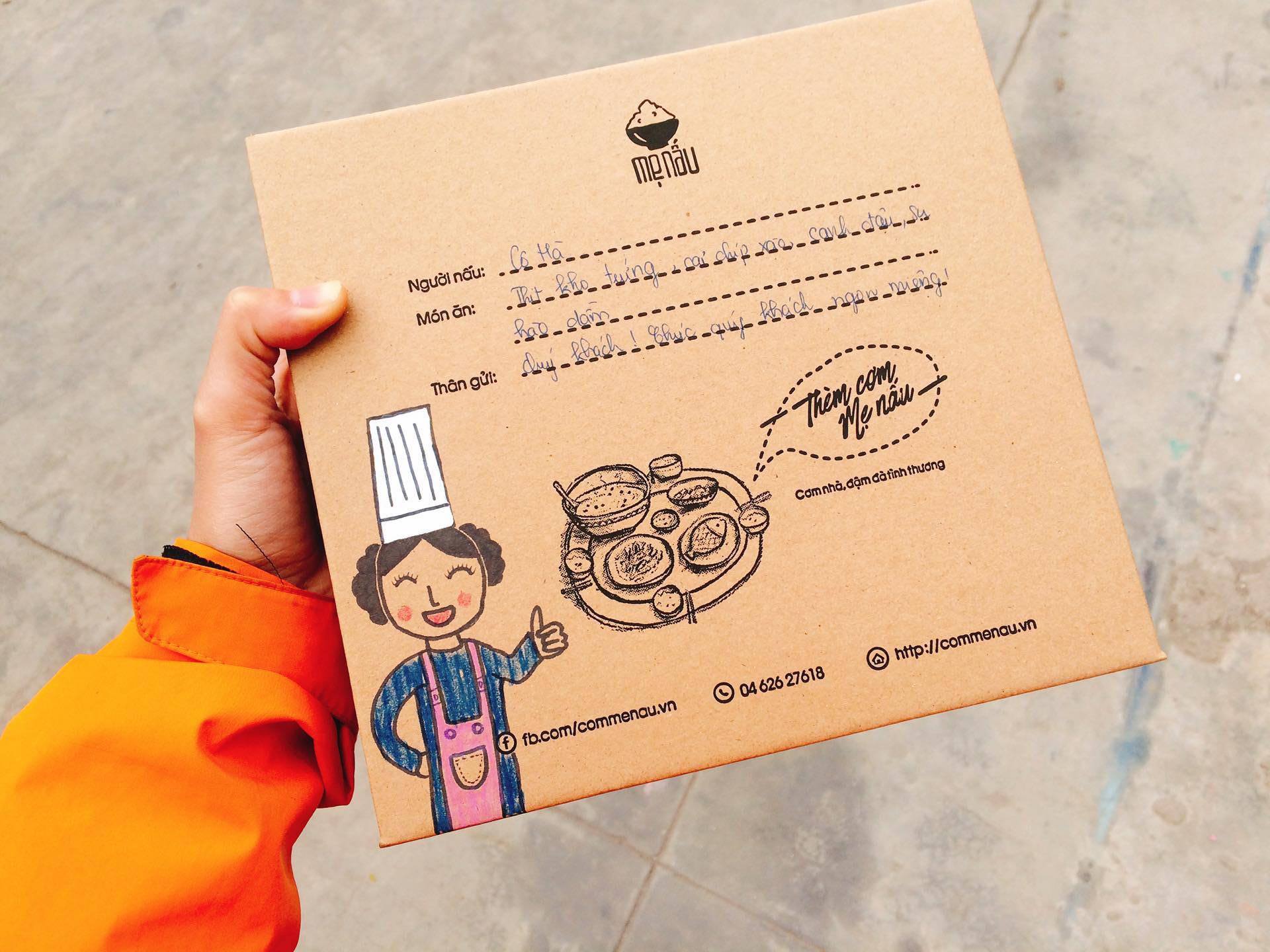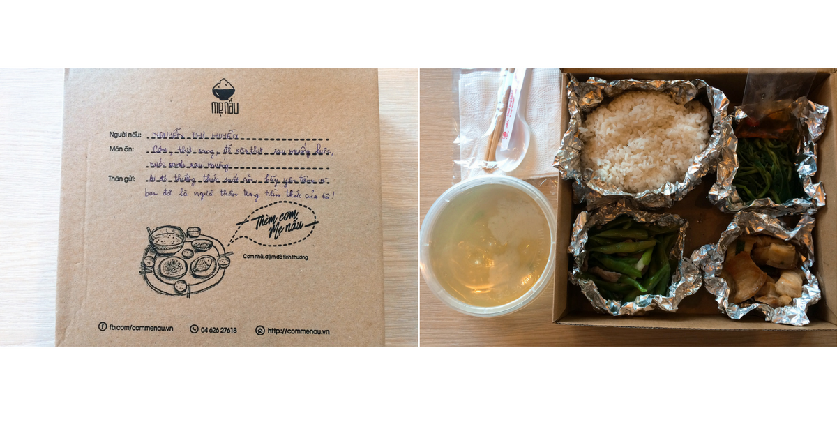 Vậy là vào khoảng 11h trưa, đội ngũ của mô hình Cơm mẹ nấu sẽ đến nhà cô Thu để lấy những suất cơm này và chuyển đến trực tiếp cho khách hàng. Mỗi suất cơm được đóng gói bao gồm một phần cơm trắng, một món rau, canh và một đến hai món đạm. Tất cả đều được bọc trong giấy bạc và để trong hộp giấy để giữ nhiệt. Giá thành của mỗi suất cơm là 35.000 đồng, tương đương với một suất ăn trung bình nấu tại nhà. Sáng lập nên mô hình cơm mẹ nấu là ba bạn trẻ Võ Ngọc Quý, sinh năm 1991, tốt nghiệp ĐH Quốc Gia Hà Nội, Nguyễn Bảo Khang, sinh năm 1991, cử nhân ĐH North California và Tạ Phước Hải, sinh năm 1989, ĐH Khoa học tự nhiên TP.HCM.