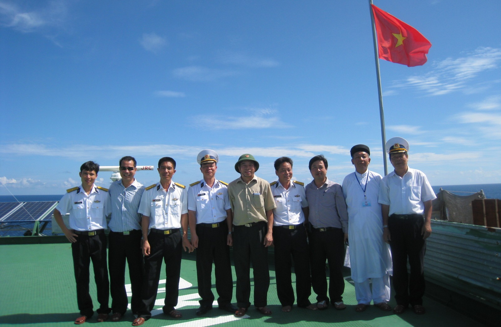 | Các cán bộ chiến sĩ nhà giàn DK1/11 chụp ảnh cùng đoàn đại biểu từ đất liền ra thăm trên nóc nhà giàn. |