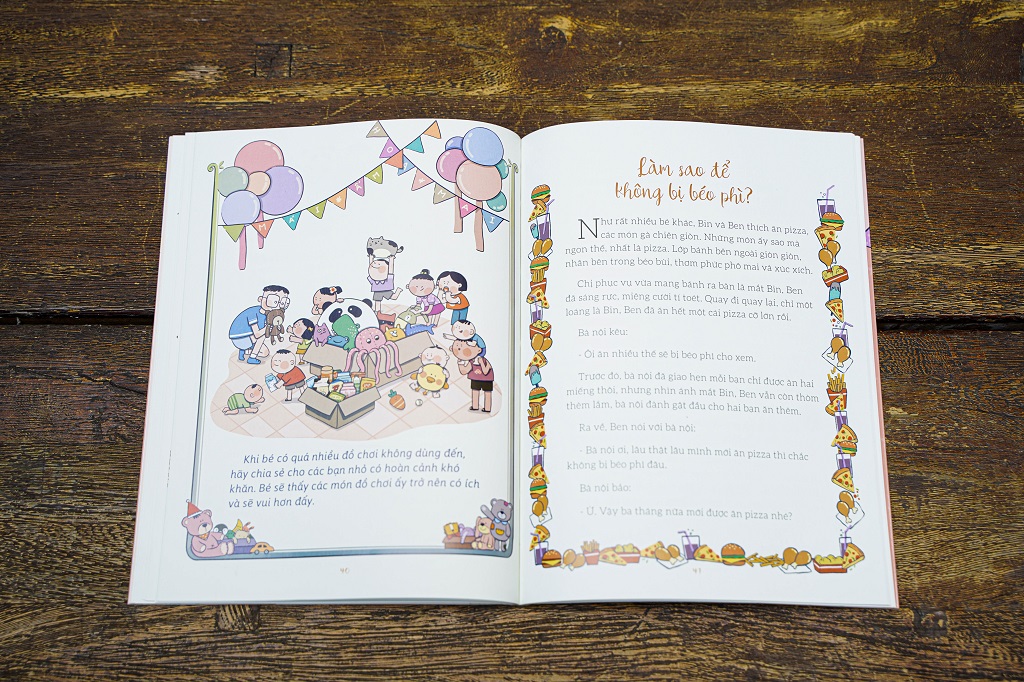 Thú vị hơn, khi những kết luận là những vần thơ để các bạn nhỏ có thể dễ dàng học thuộc, như: “Tạm biệt pizza nhé/ Chào luôn mấy miếng gà/ Hamburger béo ngậy/ Đừng gọi bé nữa nha.” hay: “Tay chân hay mắt mũi/ Miệng và bụng với lưng/ Đều là anh em cả/ Đều thương nhau vô cùng” rồi “Bé thích làm bác sĩ/ Hay thích lái máy bay/ Rồi làm chú đầu bếp/ Hay thầy giáo mỗi ngày?/ Bé cứ học thật giỏi/ Lớn lên là biết ngay.”