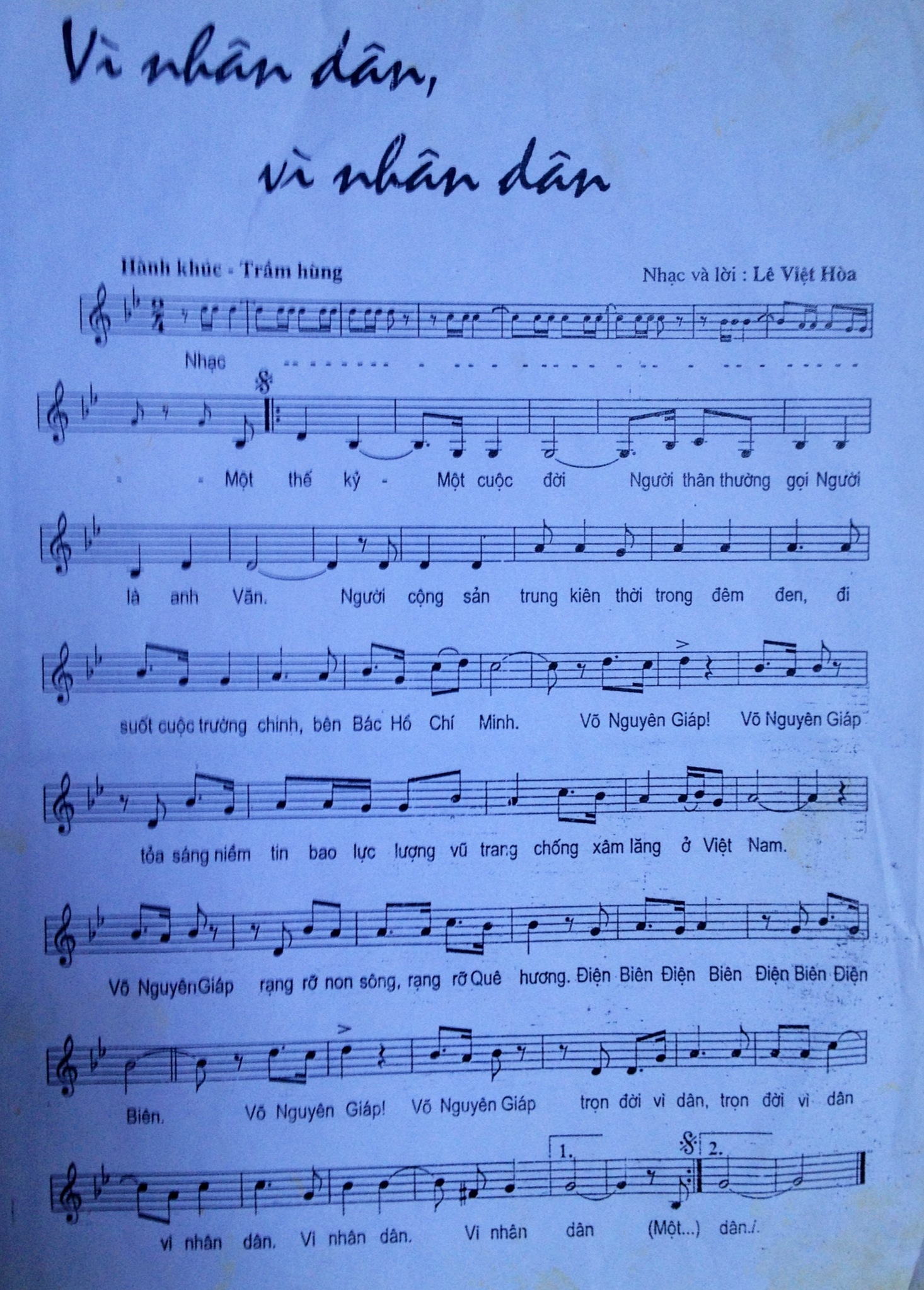 Nhạc sĩ Lê Việt Hòa đã có quãng thời gian dài làm biên tập viên ở Ban Âm nhạc, Đài Tiếng nói Việt Nam. Ông là tác giả của bài hát "Gửi em chiếc nón bài thơ" và "Gửi sông La"... Khi tôi hỏi về sự ra đời của bài hát, ông lãng đãng, và cất lời hát mà như đọc: "Một thế kỷ - Một cuộc đời. Người thân thường gọi Người là anh Văn. Người cộng sản trung kiên thời trong đêm đen, đi suốt cuộc trường chinh, bên Bác Hồ Chí Minh. Võ Nguyên Giáp! Võ Nguyên Giáp tỏa sáng niềm tin bao lực lượng vũ trang chống xâm lăng ở Việt Nam...". Bài hát "Vì nhân dân, vì nhân dân" viết ở thể hành khúc, trầm lắng, thiết tha.